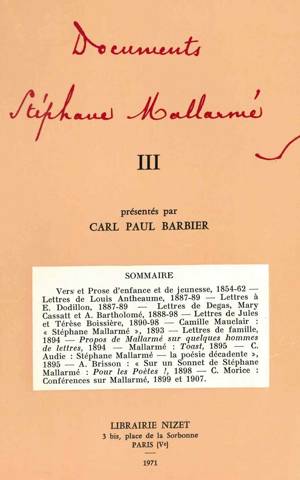 Dans ce premier tome des Documents Mallarmé , Carl Paul Barbier donne plusieurs lettres envoyées au poète, la "version ancienne" de Prose pour des Ess...Savoir plus