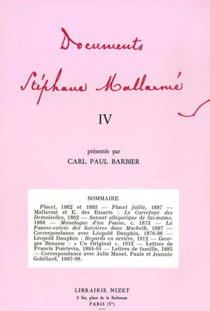 Cette quatrième livraison des Documents Stéphane Mallarmé par Carl Paul Barbier est surtout consacré à la correspondance du poète : avec Julie Manet (...Savoir plus