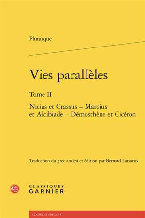 Vies parallèles. Vol. 2. Nicias et Crassus, Marcius et Alcibiade, Démosthène et Cicéron Plutarque juxtapose les destins d'un Grec et d'un Romain qu'un...Savoir plus