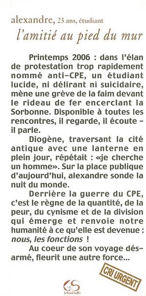 Au printemps 2006, dans l'élan de protestation contre le Contrat première embauche, un étudiant lucide mène une grève de la faim devant le rideau de f...Savoir plus