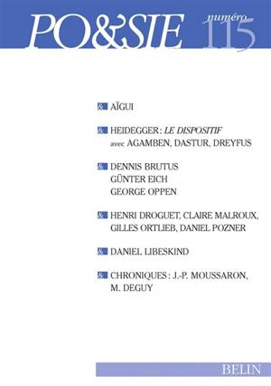 Poesie 115 Aïgui par Claude Mouchard Martin Heidegger Le dispositif, traduit de l'allemand par Servanne Jollivet Giorgio Agamben Théorie des dispositi...Savoir plus