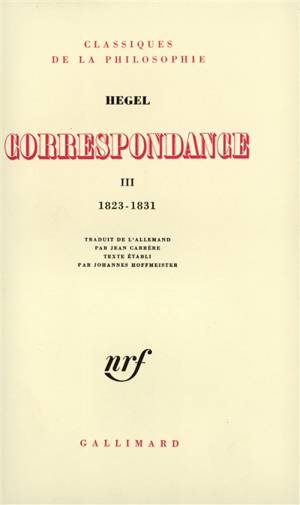 Ce troisième et dernier volume de la Correspondance de Hegel s'étend de 1823 jusqu'à sa mort, survenue en 1831. Durant ces années où Hegel consacre pr...Savoir plus