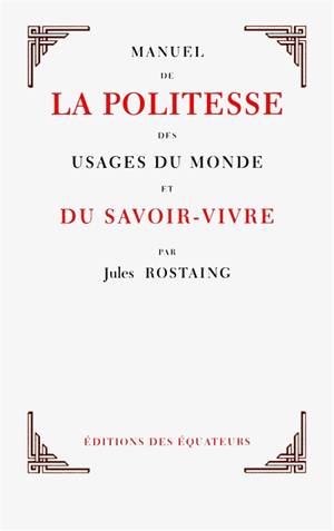 Le "Manuel de la politesse des usages du monde et du savoir-vivre" de Jules Rostaing est une œuvre précieuse qui, au XIXe siècle, cherche à établir le...Savoir plus