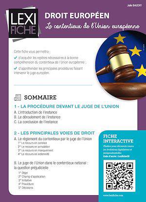 Cette fiche vous permettra : d’acquérir les repères nécessaires à la bonne compréhension du contentieux de l’Union européenne ; d’appréhender les prin...Savoir plus