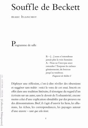 Souffle de Beckett Écrit en 1969, Souffle est une pièce de 35 secondes présentée comme un intermède. D'une brièveté absolue, dans l'oeuvre de Beckett ...Savoir plus