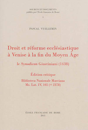 Droit et réforme ecclésiastique à Venise à la fin du Moyen Âge Le Synodicon Giustiniani (1438) : édition critique, Biblioteca Nazionale Marciana MS. L...Savoir plus