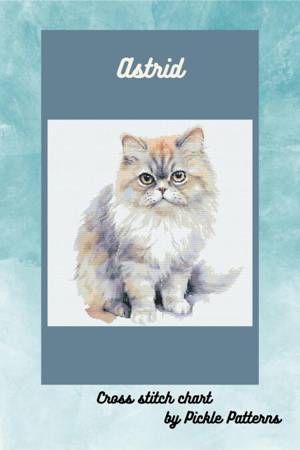 The image is a cross-stitch rendering of a Persian cat. The cat is the focal point, occupying most of the frame. It is presented in a seated position,...Savoir plus