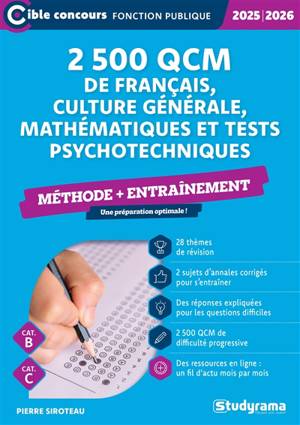 2 500 QCM de français, culture générale, mathématiques et tests psychotechniques Méthode + Entraînement Un outil indispensable Cet ouvrage s'adresse a...Savoir plus