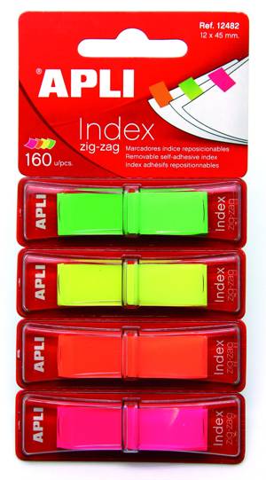 Paquet de 4 dévidoirs de 40 marque-pages en polypropylène en Zigzag de 45 x 12 mm souples. 4 couleurs fluorescentes: vert fluo, jaune fluo, orange flu...Savoir plus
