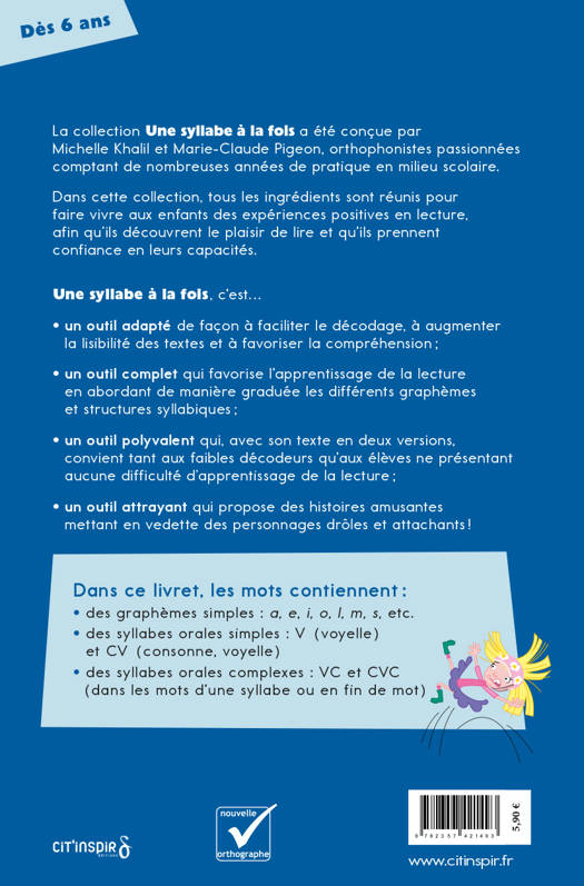 Des textes adaptés pour lire plus facilement ! Pour faciliter l’apprentissage de la lecture, les mots qui composent les histoires ont été sélectionnés en fonction de leur familiarité, de leur structure syllabique et des graphèmes* qu’ils contiennent. Plusieurs adaptations visuelles permettent de réduire la charge cognitive liée au décodage et de limiter l’encombrement perceptif. Les livrets contiennent deux fois la même histoire : dans la première version, syllabes orales, lettres muettes et graphèmes complexes sont mis en relief ; dans la seconde, ces adaptations ne sont pas présentes. Ce sont donc des outils polyvalents qui favorisent le transfert des acquis et qui conviennent à tous les enfants. Les histoires fantaisistes mettent en scène des personnages rigolos et attachants. La trame narrative captive les jeunes lecteurs tout en leur permettant de faire des prédictions. Les illustrations leur donnent aussi de nombreuses occasions de faire des inférences.