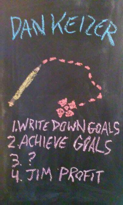 "1. Write Down Goals 2. Achieve Goals 3. ? 4. Jim Profit" explains how to set clear, written goals and have a specific plan to achieve them for a successful life.