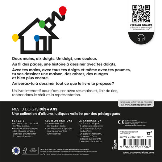 LES PLUS • Des textes courts avec du vocabulaire autour des doigts, des couleurs et des verbes d’action. • Des illustrations épurées et didactiques pour inviter l’enfant à exercer ses doigts et à reproduire les gestes, réalisées par Martine Perrin • Un QR Code pour écouter la lecture de l’album • Une fabrication de qualité, solide et résistante aux petites mains ! • Un livre adapté à la lecture adulte-enfant pour un moment privilégié • Une conception éthique et engagée