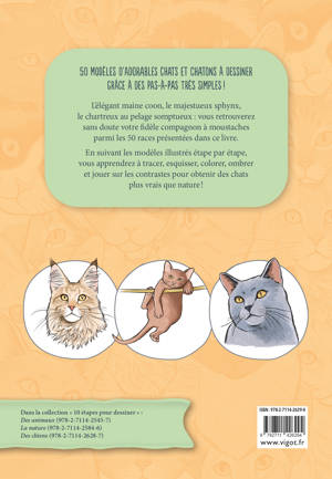 L’élégant maine coon, le majestueux sphynx, le chartreux au pelage somptueux : vous retrouverez sans doute votre fidèle compagnon à moustaches parmi les 50 races présentées dans ce livre. En suivant les modèles illustrés étape par étape, vous apprendrez à tracer, esquisser, colorer, ombrer et jouer sur les contrastes pour obtenir des chats plus vrais que nature !