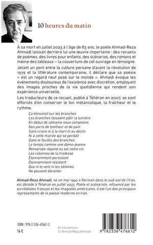 À sa mort en juillet 2023 à l’âge de 83 ans, le poète Ahmad-Reza Ahmadi laissait derrière lui une œuvre importante : des recueils de poèmes, des livres pour enfants, des scénarios, des romans et même des tableaux – la couverture de cet ouvrage en témoigne. Jetant un pont entre la culture persane d’avant la révolution de 1979 et la littérature contemporaine, il déclare que sa poésie « est un regard neuf posé sur le monde ». Ahmadi évoque les événements douloureux de l’existence avec discrétion, employant des images proches de la vie quotidienne qui rendent son expérience universelle. Les traducteurs de ce recueil, publié à Téhéran en 2007, se sont efforcés d’en conserver le ton mélancolique, la fraîcheur et le rythme.