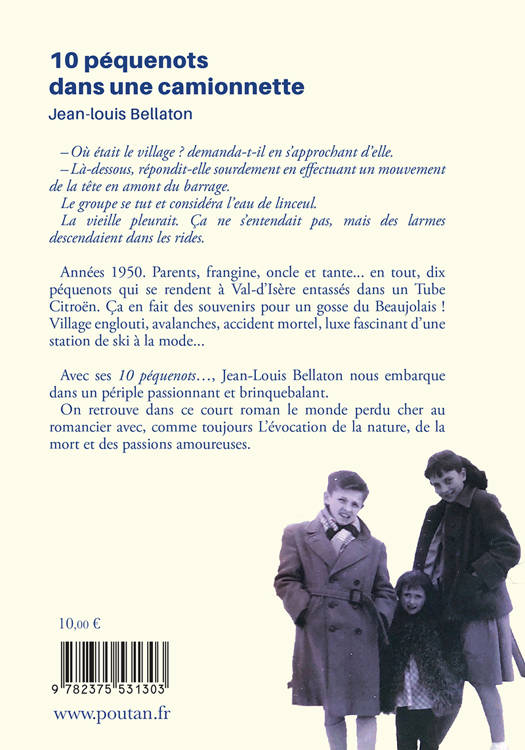 Années 1950. Parents, frangine, oncle et tante... en tout, dix péquenots qui se rendent à Val d’Isère entassés dans un Tube Citroën. Ça en fait des souvenirs pour un gosse du Beaujolais ! Village englouti, avalanches, accident mortel, luxe fascinant d’une station de ski à la mode... Avec ses 10 péquenots…, Jean-Louis Bellaton nous embarque dans un périple passionnant et brinquebalant. On retrouve dans ce court roman le monde perdu cher au romancier avec, comme toujours, l’évocation de la nature, de la mort et des passions amoureuses.