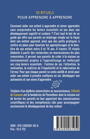 Comment aider son enfant à apprendre et aimer apprendre sans comprendre les leviers essentiels en jeu dans son développement cognitif et scolaire ? C'est tout le but de ce guide qui offre aux parents un éclairage simple sur la façon dont son enfant apprend, ainsi que des outils pratiques à mettre en place pour favoriser les apprentissages et le bien-être de son enfant entre 6 et 14 ans. à travers 10 rituels élaborés à partir des recherches en neurosciences les plus renommées, il permet aux parents de créer à la maison un environnement propice à l'apprentissage en renforçant ses cinq leviers essentiels : l'estime de soi, l'attention, la motivation, la maitrise de l'impulsivité et la valorisation de l'erreur. Pour que chaque parent se sente outillé et armé pour aider son enfant à prendre confiance en soi, développer son autonomie et son envie d'apprendre.