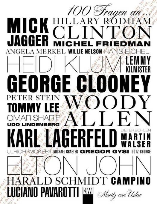 Prominente im Schnellfeuer-Verhör: Höllisch viele Fragen in höllisch kurzer Zeit Aus der Not heraus kreierte der Journalist und Autor Moritz von Uslar vor fünf Jahren eine Interviewform, die heute zum originellsten und erhellendsten gehört, was es im deutschen Blätterwald über Prominente zu lesen gibt. Im Sinne der Ansage »So schnell wie möglich, denn wir haben ja nicht ewig Zeit« stellt er Berühmtheiten wie George Clooney, Elton John oder Hillary Clinton exakt 100 Fragen. Subversive und unverschämte Fragen, wie die an Woody Allen: »Kennen Sie etwas Originelleres, als 'Uh, Baby!' zu stöhnen beim Orgasmus?« Eigentlich als Gegenwehr auf die absurden Bedingungen gedacht, unter denen Hollywoodstars interviewt werden, erschuf Uslar eine Kunstform, in der sich die Gesprächspartner von einer gänzlich unbekannten Seite zeigen. Und das nicht nur im druckvollen Frage-und-Antwort-Spiel, sondern gerade auch durch ihre Körpersprache, durch Blicke und Gesten, die Uslar in wunderbar genauen, respektlosen Zwischenkommentaren beschreibt. Uslars 100 Fragen, einer großen Fangemeinde bekannt durch ihre Veröffentlichung im SZ-Magazin, sind Extremtexte - messerscharf und gefährlich dicht dran.Interviewpartner: Mick Jagger - Peter Stein - Woody Allen - Udo Lindenberg - Michel Friedman - Harald Schmidt - Angela Merkel - Götz George - Dieter Bohlen - Elton John - Karl Lagerfeld - Luciano Pavarotti - Willie Nelson - Ulrich Wickert - George Clooney - Heidi Klum - Hillary Rodham Clinton - Martin Walser u. a.