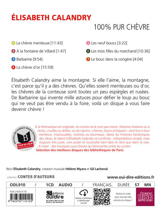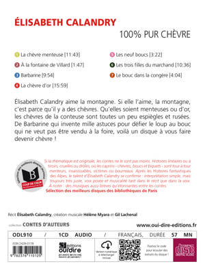 Élisabeth Calandry aime la montagne. Si elle l'aime la montagne, c'est parce qu'il y a des chèvres. Qu'elles soient menteuses ou d'or, les chèvres de la conteuse sont toutes un peu espiègles et rusées… Pensez à la chèvre Barbarine qui invente mille astuces pour défier le loup. Et si le bouc s'en mêle c'est à vous faire devenir chèvre !