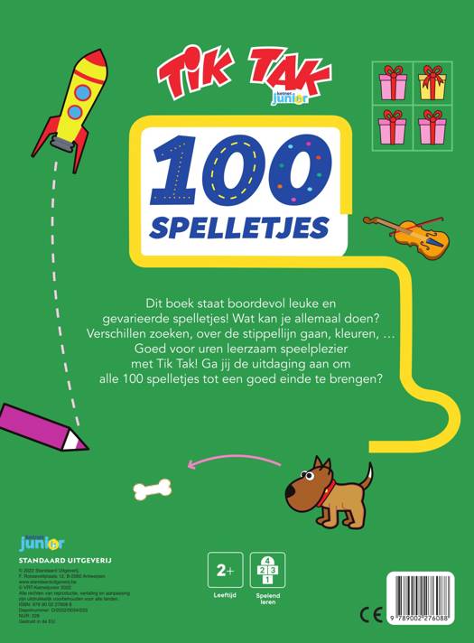 Een dik boek met 100 leuke en gevarieerde spelletjes op kleutermaat. Verschillen zoeken, over de stippellijn gaan, kleuren, eenvoudige puzzels oplossen … Goed voor uren leerzaam speelplezier met Tik Tak!