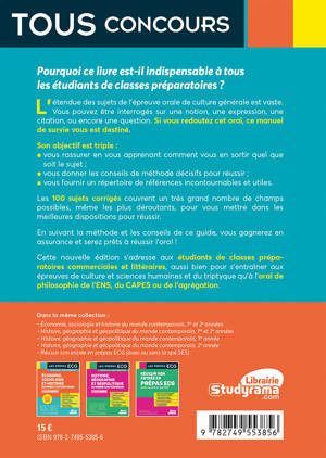 Un ouvrage synthétique et facile d’accès pour réussir les oraux de culture générale (HEC et le triptyque, classes prépas littéraires, CAPES et agrégation de philosophie) proposant une très grande variété de sujets, parfois surprenants, et des conseils accompagnés de méthode pour rassurer les étudiants. L'auteur présente une liste de termes, tics de langage et expressions à éviter, ainsi que des moyens de les remplacer. En fin d'ouvrage, les candidats trouveront un petit répertoire de références mobilisables sur un grand nombre de sujets.