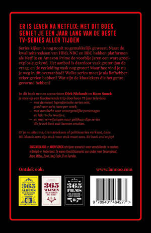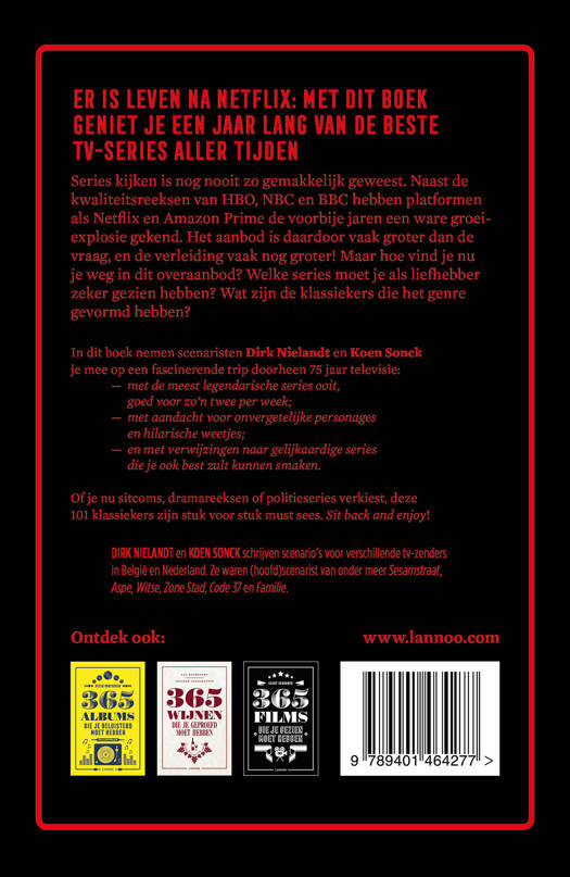 Series kijken is nog nooit zo gemakkelijk geweest. Naast de kwaliteitsreeksen van HBO, NBC en BBC hebben platformen als Netflix en Amazon Prime de voorbije jaren een ware groeiexplosie gekend. Het aanbod is daardoor vaak groter dan de vraag, en de verleiding vaak nog groter! Maar hoe vind je nu je weg in dit overaanbod? Welke series moet je als liefhebber zeker gezien hebben? Wat zijn de klassiekers die het genre gevormd hebben? In dit boek nemen scenaristen Dirk Nielandt en Koen Sonck je mee op een fascinerende trip doorheen 75 jaar televisie: