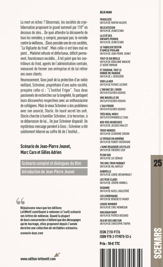Scénario complet et dialogues du film "110 en dessous de zéro" écrit par Jean-Pierre Jeunet, Marc Caro et Gilles Adrien Scénario original écrit avant "Delicatessen" et "La Cité des enfants perdus", jamais tourné, totalement inédit !