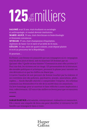 En France, une femme est assassinée par son compagnon ou ex-compagnon tous les deux jours et demi, soit en moyenne 125 femmes par an. Qui sont-elles ? Quelle est leur histoire ? Comment en sont-elles arrivées là ? Pour une fois, les victimes ont un visage. 125 personnalités de la littérature, des mondes politiques et artistiques, prennent la plume pour raconter ces vies détruites et ce que les chiffres ne disent pas. À travers l’analyse de son parcours de femme touchée par la violence et ses entretiens avec des policiers, psychiatres, avocats, associations, philosophes…, Sarah Barukh cherche à comprendre l’emprise, les schémas communs aux féminicides et le rôle de la société dans ces assassinats. Un livre hommage pour se souvenir et faire réfléchir à notre implication à tous, collectivement. 125 voix et des milliers se lèvent pour que ces meurtres cessent.