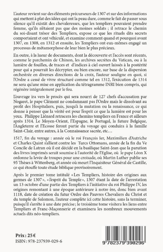 Le vrai trésor des Templiers n'est pas perdu. A la lueur de documents, dont la découverte et l'accès sont récents, comme le parchemin de Chinon, les archives secrètes du Vatican, ou à la lumière de fouilles, de traces et  d'indices à ciel ouvert laissés à la postérité pour qui pourrait les décrypter, ou bien encore, sur base de la dispersion orchestrée en diverses directions de la croix, l'auteur souligne en quoi, si l'Ordre a cessé de vivre structuré comme tel en 1312, l'exécution de 1314 qui couronne le procès suivant l'arrestation du vendredi 13 octobre 1307 ne sera qu'une mise en application du tétragramme INRI, qui régénère intégralement par le feu. En passant par la famille Saint-Clair, l'ouvrage amène à François Ier et à Léon X en 1517. Il souligne les arcanes de la Connaissance sacrée sans oublier le rôle essentiel des femmes chevaleresses et des compagnes des Templiers. Â