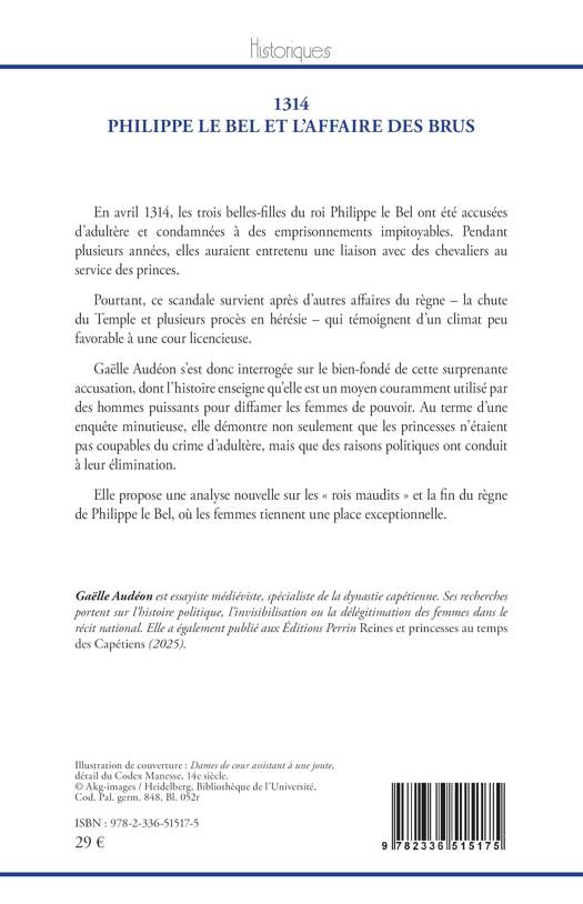 En avril 1314, les trois belles-filles du roi Philippe le Bel ont été accusées d'adultère et condamnées à des emprisonnements impitoyables. Pendant plusieurs années, elles auraient entretenu une liaison avec des chevaliers au service des princes. Pourtant, ce scandale survient après d'autres affaires du règne - la chute du Temple et plusieurs procès en hérésie - qui témoignent d'un climat peu favorable à une cour licencieuse. Gaëlle Audéon s'est donc interrogée sur le bien-fondé de cette surprenante accusation, dont l'histoire enseigne qu'elle est un moyen couramment utilisé par des hommes puissants pour diffamer les femmes de pouvoir. Au terme d'une enquête minutieuse, elle démontre non seulement que les princesses n'étaient pas coupables du crime d'adultère, mais que des raisons politiques ont conduit à leur élimination. Elle propose une analyse nouvelle sur les rois maudits et la fin du règne de Philippe le Bel, où les femmes tiennent une place exceptionnelle.