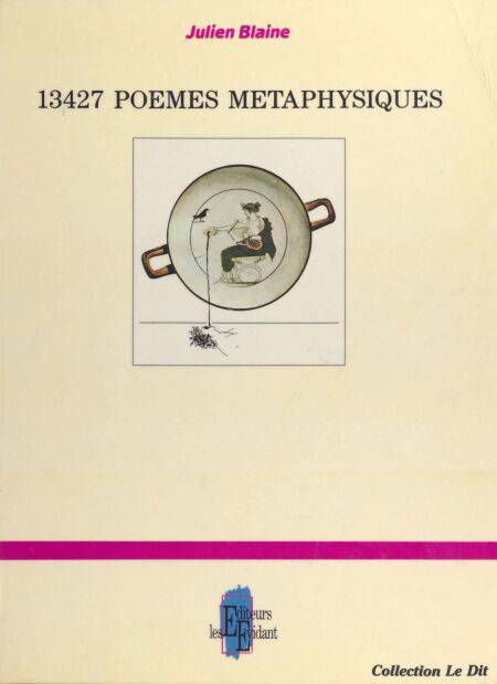 Au commencement du métaphysique, Julien Blaine naît sur les rives - alors nettes - de l'étang de Berre. Sa voix ne le quittera plus. Il crée 9 revues, collabore à une centaine, institue Dock(s) International. 44 ans de cette fréquentation poétique, lui imposent une expression nouvelle et fondamentale : le poème métaphysique. Métaphysique, car au-delà de l'évidence plate et forme appelée à être - à la poésie élémentaire - ce que le sonnet est à la classique. 13 427 poèmes métaphysiques est le chiffre ultime et plein de cette recherche, première à ouvrir « Le Dit », collection poétique et théâtrale des Éditeurs Évidant (nous évidons).