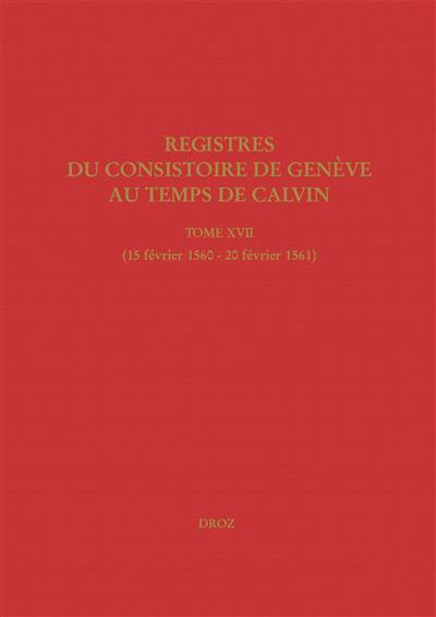 Le dix-septième volume des Registres du Consistoire de Genève couvre 1560, une année tumultueuse. Pour la première fois, il y a des bourgeois (i.e., citoyens naturalisés), y compris le marquis Galéas Caracciolo, parmi les membres laïques du tribunal des mœurs. Dans ces registres, le Consistoire dénonce vivement plusieurs hommes qui ont participé à la conjuration d’Amboise, prélude aux guerres de religion. En 1560, Genève connaît des difficultés économiques et le Consistoire fait preuve d’empathie envers les pauvres tout en prenant des mesures contre la paresse et la dissipation. Le Consistoire et le Conseil se montrent plus sévères à l’encontre de la danse et condamnent à des amendes ou à quelques jours de prison. Plusieurs femmes sont convoquées parce qu’elles continuent d’observer certaines pratiques catholiques, surtout les prières à la Vierge Marie. Dans ce tome se trouve l’affaire la plus mémorable se déroulant devant le Consistoire du vivant de Calvin. Elle concerne deux femmes soi-disant prophètes qui prétendent recevoir des visions célestes ; en outre, l’une d’elles déclare que, par décret divin, Jean Calvin est son mari.