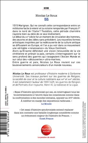 1515 Marignan. Qui ne connaît cette correspondance entre un millésime facile à retenir et la victoire remportée par François Ier dans le nord de l’Italie ? Cet essai d’histoire synchronisée entend replacer dans son contexte une bataille longtemps considérée comme une date majeure de l’histoire de France. Le début du XVIe siècle fut un moment de circulation des hommes, des œuvres et des idées sans précédent. Les nouvelles formes artistiques inspirées par la redécouverte de la culture antique se diffusaient en Europe, et l’on a pu voir dans ce mouvement une véritable « renaissance » du Vieux Continent. Alors qu’Érasme défendait une vision renouvelée de la vie chrétienne et prônait la paix entre les créatures de Dieu, certains s’interrogeaient sur le sens profond des guerres qui ravageaient l’Ancien Monde et sur celui des « découvertes » ultra-marines. Ces événements n’annonçaient-ils pas la fin des temps ?