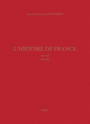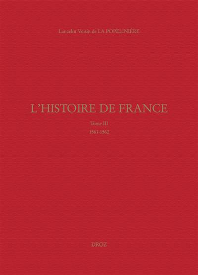 Ce troisième tome de L’Histoire de France de La Popelinière, parue en 1581, est centré sur deux années cruciales, 1561 et 1562, qui voient le déclenchement des guerres de Religion. Il fait le récit des principaux événements de l’avènement de Charles IX jusqu’à l’automne 1562 : les États généraux et le colloque de Poissy, l’édit de Janvier, le « meurtre » de Wassy, les déclarations du prince de Condé et ses négociations avec les princes allemands, l’engagement puis les hésitations de la noblesse réformée, et s’attarde sur quelques épisodes de la première guerre civile (particulièrement Angers et Toulouse). Hors de France, il s’intéresse aussi à la résistance armée des vaudois du Piémont contre le duc de Savoie, et décrit la « république des Suisses ». Les notes critiques s’attachent principalement, comme dans les volumes précédents, à retrouver les sources utilisées et à éclairer le travail de recomposition et de neutralisation de l’historien sur ses sources.