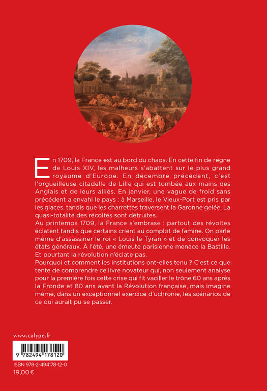 En 1709, la France est au bord du chaos. En cette fin de règne de Louis XIV, les malheurs s'abattent sur le plus grand royaume d'Europe. En décembre précédent, c'est l'orgueilleuse citadelle de Lille qui est tombée aux mains des Anglais et de leurs alliés. En janvier, une vague de froid sans précédent a envahi le pays : à Marseille, le Vieux-Port est pris par les glaces, tandis que les charrettes traversent la Garonne gelée. La quasi-totalité des récoltes sont détruites.