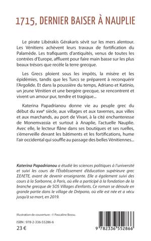 Le pirate Libérakis Gérakaris sévit sur les mers alentour. Les Vénitiens achèvent leurs travaux de fortification du Palamède. Les trafiquants d'antiquités, venus de toutes les contrées d'Europe, affluent pour faire main basse sur les plus beaux trésors que recèle la terre grecque. Les Grecs ploient sous les impôts, la misère et les épidémies, tandis que les Turcs se préparent à reconquérir l'Argolide. Et dans la poussière du temps, Adriano et Katinio, un jeune Vénitien et une bergère grecque, se rencontrent et vivent un amour pur, tendre et tragique... Katerina Papadrianou donne vie au peuple grec du début du XVIIIe siècle, aux villages et aux tavernes, aux villes et aux marchands, au port de Vivari, à la cité enchanteresse de Monemvassia et surtout à Anaplie, l'actuelle Nauplie. Avec elle, le lecteur flâne dans ses boutiques et ses ruelles, s'émerveille devant les bâtiments et les fortifications, hume l'air occidental qui souffle au passage des belles Vénitiennes...
