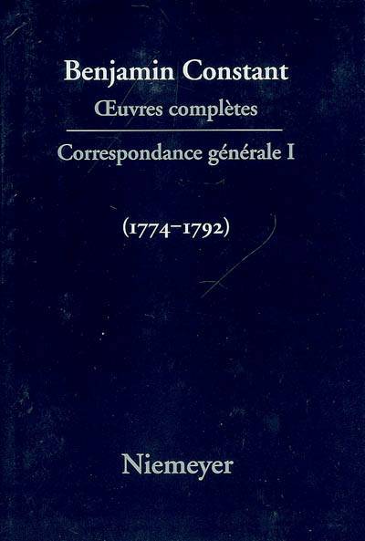 Le premier volume de la Correspondance générale de Benjamin Constant couvre la période qui va de 1774 à 1792 et contient les lettres que l'enfant adresse, dès son plus jeune âge, aux membres de sa famille, celles de l'étudiant que son père a envoyé suivre des études aux universités d'Erlangen et d'Edimbourg, celles du jeune homme qui est en fugue vers l'Angleterre et l'Ecosse et correspond avec Mme de Charrière, celles enfin du chambellan qui s'ennuie à la cour de Brunswick, où il va notamment faire l'expériance d'un mariage malheureux. Le volume a été préparé par les soins du Directeur de la Correpondance générale, Cecil P. Courtney, de l'Université de Cambridge, assisté de Dennis Wood, de l'Université de Birmingham.