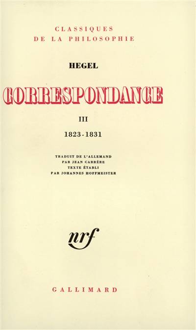 Ce troisième et dernier volume de la Correspondance de Hegel s'étend de 1823 jusqu'à sa mort, survenue en 1831. Durant ces années où Hegel consacre presque toute son activité à son enseignement à l'Université de Berlin, commence à se former une école étroitement attachée à sa doctrine et, malgré les attaques hargneuses de ses adversaires, Hegel apparaît comme le maître incontesté de la philosophie allemande. Au premier rang de ses admirateurs, il convient de citer Victor Cousin, auquel le lie une étroite amitié - dont leur correspondance apporte le témoignage - et qui s'efforce de faire connaître en France la philosophie hégélienne. La dédicace à Hegel de la traduction du Gorgias de Platon par Cousin, que nous publions en annexe avec d'autres documents, exprime avec chaleur cette amitié et cette admiration. On lira avec un intérêt particulier les lettres adressées par Hegel à sa femme lors de son voyage à Paris, "cette capitale du monde civilisé", en septembre 1827, et dans lesquelles s'exprime, en même temps que sa reconnaissance pour l'accueil amical de Cousin, son intérêt très vif pour les formes les plus diverses de la culture française.