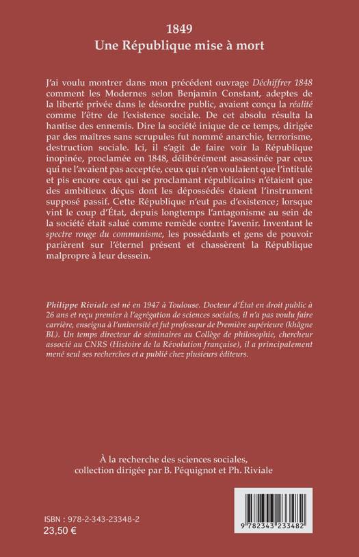 J’ai voulu montrer dans mon précédent ouvrage Déchiffrer 1848 comment les Modernes selon Benjamin Constant, adeptes de la liberté privée dans le désordre public, avaient conçu la réalité comme l’être de l’existence sociale. De cet absolu résulta la hantise des ennemis. Dire la société inique de ce temps, dirigée par des maîtres sans scrupules fut nommé anarchie, terrorisme, destruction sociale. Ici, il s’agit de faire voir la République inopinée, proclamée en 1848, délibérément assassinée par ceux qui ne l’avaient pas acceptée, ceux qui n’en voulaient que l’intitulé et pis encore ceux qui se proclamant républicains n’étaient que des ambitieux déçus dont les dépossédés étaient l’instrument supposé passif. Cette République n’eut pas d’existence ; lorsque vint le coup d’État, depuis longtemps l’antagonisme au sein de la société était salué comme remède contre l’avenir. Inventant le spectre rouge du communisme, les possédants et gens de pouvoir parièrent sur l’éternel présent et chassèrent la République malpropre à leur dessein.