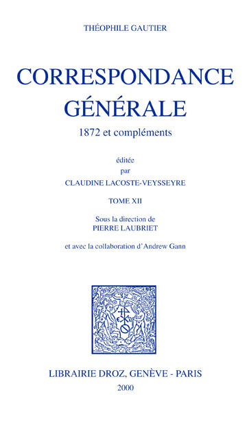 Ce dernier volume de la correspondance de Gautier comprend trois parties : les lettres de l'année 1872, terminant ainsi la publication chronologique des lettres datées et datables ; les lettres non datées, classées par ordre alphabétique des noms des correspondants ; un complément des onze premiers volumes.