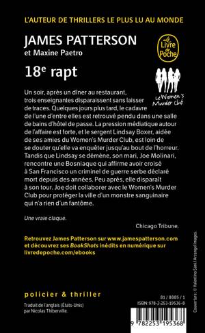 Un soir, après un dîner au restaurant, trois collègues enseignantes disparaissent sans laisser de traces. Quelques jours plus tard, le cadavre d’une femme est retrouvé pendu dans la salle de bains d’un hôtel de passe. La pression médiatique est forte autour de cette affaire, et le sergent Lindsay Boxer, aidée de ses amies du Women’s Murder Club, ira de surprise en surprise, jusqu’au bout de l’horreur. Tandis que Lindsay se démène pour résoudre l’enquête, son mari, Joe Molinari, rencontre une Bosniaque qui affirme avoir croisé, à San Francisco, un criminel de guerre serbe déclaré mort depuis des années. Peu après, elle disparaît à son tour. Joe doit collaborer avec le Women’s Murder Club pour protéger la ville d’un monstre sanguinaire qui n’a rien d’un fantôme.