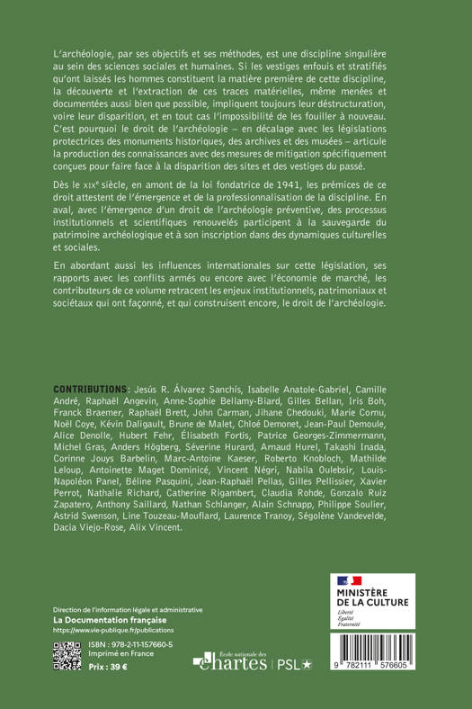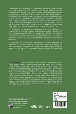 Cet ouvrage propose une analyse de la genèse et des évolutions du droit de l’archéologie en France. Depuis, la loi du 27 septembre 1941 sur les règlements des fouilles archéologiques et jusqu’à celle du 17 janvier 2001 sur l’archéologie préventive, nous assistons à une mise en lumière des conditions d’élaboration des législations en vigueur, dans leur contexte historique, juridique et administratif. Les auteurs retracent en six chapitres les enjeux institutionnels, patrimoniaux et sociétaux qui ont façonnés, et construisent encore, le droit de l'archéologie.