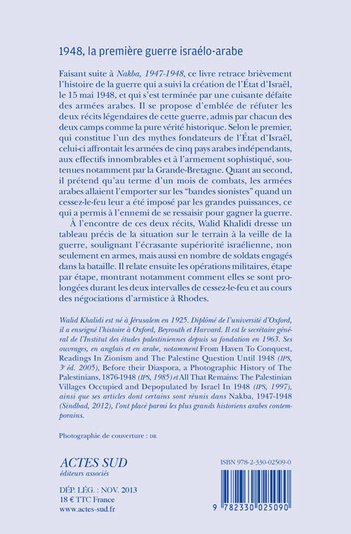 Faisant suite à «Nakba, 1947-1948», ce livre retrace brièvement, mais avec cartes et documents inédits à l'appui, l'histoire de la guerre qui a suivi la création de l'État d'Israël, le 15 mai 1948, et qui s'est terminée par une cuisante défaite des armées arabes. L'auteur y réfute les deux récits mythiques de cette guerre, admis par chacun des camps comme la pure vérité historique.