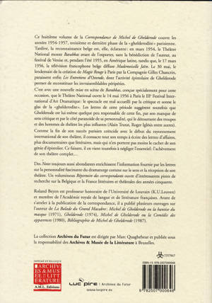 Ce huitième volume de la Correspondance de Michel de Ghelderode couvre les années 1954-1957, troisième et dernière phase de la "ghelderodite" parisienne. Tardive, la reconnaissance belge est, elle, éclatante: en mars 1954, le Théâtre National monte Barabbas avant de l'exporter, sans la bénédiction de l'auteur, au festival de Venise et, pendant l'été 1955, en Amérique latine, tandis que, le 17 mars 1956, la télévision francophone belge diffuse Mademoiselle Jaïre. Le 30 mai, le lendemain de la création de Magie Rouge à Paris par la Compagnie Gilles Chancrin, paraissent enfin Les Entretiens d'Ostende, dont l'activité épistolaire de Ghelderode permet de reconstituer les invraisemblables péripéties. C'est avec une nouvelle mise en scène de Barabbas, conçue spécialement pour cette occasion, que le Théâtre National ouvre le 14 mai 1956 à Paris le IIIe Festival International d'Art Dramatique: le spectacle est mal accueilli par la critique et sonne le glas de la "ghelderodite". Les lettres de cette période suggèrent toutefois que Ghelderode est lui-même quelque peu responsable de cette fin, par son manque de sens critique et par le côté paranoïde de sa personnalité, qui le détournent des troupes et des hommes de théâtre les plus influents (Alain Trutat, Roger Iglésis entre autres). Comme la fin de son succès parisien coïncide avec le début du rayonnement international de son théâtre, il consacre tout son temps à écrire des lettres d'affaires, plus documentaires que littéraires, mais qui n'en portent pas moins le cachet de son génie d'épistolier. Cc faisant, il en vient toutefois à négliger l'essentiel: l'achèvement de son théâtre complet... Des Notes toujours aussi abondantes enrichissent l'information fournie par les lettres sur la personnalité fascinante du dramaturge comme sur le sens et la réception de son théâtre. Un volumineux Répertoire des correspondants ouvre d'intéressantes pistes de recherche sur la Belgique et la France littéraires et théâtrales des années cinquante.
