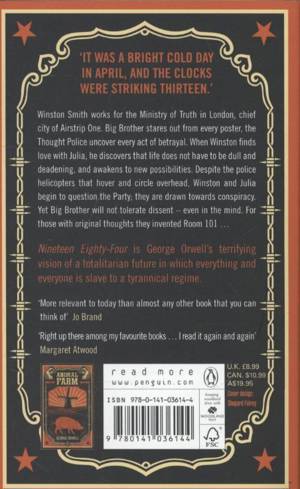 Winston Smith works for the Ministry of Truth in London, chief city of Airstrip One. Big Brother stares out from every poster, the Thought Police uncover every act of betrayal. When Winston finds love with Julia, he discovers that life does not have to be dull and deadening, and awakens to new possibilities.