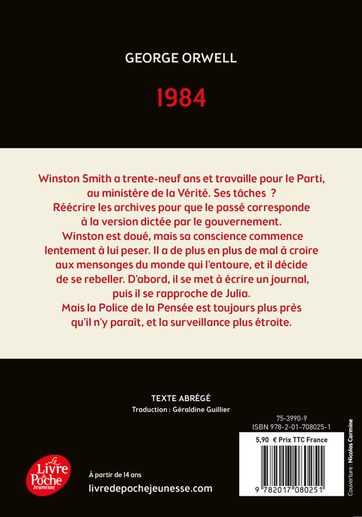 Winston Smith a trente-neuf ans et travaille pour le Parti, au ministère de la Vérité. Ses tâches ? Réécrire les archives pour que le passé corresponde à la version dictée par le gouvernement. Winston est doué, mais sa conscience commence lentement à lui peser. Il a de plus en plus de mal à croire aux mensonges du monde qui l’entoure, et il décide de se rebeller. D'abord, il se met à écrire un journal, puis il se rapproche de Julia. Mais la Police de la Pensée est toujours plus près qu’il n’y paraît, et la surveillance plus étroite.