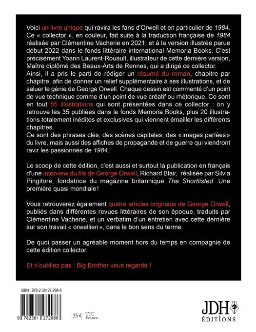 LE COLLECTOR 1984 : un produit d'exception pour les fans du roman ! Retrouvez en exclusivité mondiale, une interview du fils de George Orwell traduite en français ! Mais aussi une interview de la dernière traductrice en date de 1984... et aussi 55 illustrations commentées artistiquement et techniquement par leur créateur Yoann Laurent-Rouault, concepteur de cet ouvrage. Vous retrouverez bien sûr aussi un résumé de 1984 chapitre par chapitre, que les illustrations viennent émailler. Sans oublier quatre essais peu connus de George Orwell dont les confessions d'un critique littéraire ! L'interview de Richard Blair, le fils de George Orwell, est menée par Silvia Pingitore (fondatrice du magazine Theshortlisted). Chaque dessin des 55 qui vous sont présentés est commenté d'un point de vue technique comme d'un point de vue créatif ou rhétorique. Parmi ces 55 illustrations, on y retrouve les 35 publiées dans le fonds Memoria Books, plus 20 illustrations totalement inédites et exclusives qui viennent émailler les différents chapitres. Ce sont des phrases clés, des scènes capitales, des « images parlées » du livre, mais aussi des affiches de propagande et de guerre qui viendront ravir les passionnés de 1984. De quoi passer un agréable moment hors du temps en compagnie de cette édition collector. Et n'oubliez pas : Big Brother vous regarde !