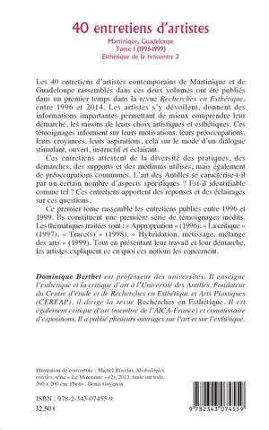 L'art des Antilles se caractérise-t-il par un certain nombre d'aspects spécifiques ? Est-il identifiable comme tel ? Voici ici des entretiens d'artistes réalisés entre 1996 et 1999. Ils constituent une première série de témoignages inédits. Les thématiques traitées sont : « Appropriation » (1996), « La critique » (1997), « Trace(s) » (1998), « Hybridation, métissage, mélange des arts » (1999). Tout en présentant leur travail et leur démarche, les artistes expliquent ce en quoi ces notions les concernent.