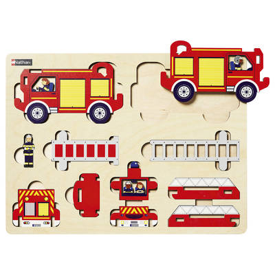 11 pièces en bois découpé et verni, à assembler selon le schéma de montage pour construire le camion de pompiers.