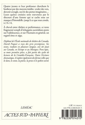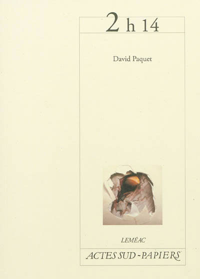 «Diplômé du programme d'écriture dramatique de l'École nationale de théâtre du Canada en 2006, David Paquet a depuis vu sa pièce »Po rc-épic«, éditée chez Dramaturges Éditeurs, et présentée à Montréal, en Allemagne, au Mexique, en Autriche, en Belgique et en France dans le cadre des cycles de lectures de la Comédie-Française. Il a participé en juillet 2008 au Séminaire international d'auteurs é mergents de la Sala Beckett à Barcelone. L'année suivante, son texte »Le Brasier« était présentée dans le cadre du festival Jamais Lu de Montréal. Gagnant de la sixième édition du concours Le théâtre jeune public et la relève, David Paquet a vu sa pièce pour adolescents »2h14« sur les planches de la Maison-Théâtre de Montréal en janvier 2010. Lauréat, pour sa pièce »Porc-épic«, des prestigieux prix littéraires du Gouverneur Général du Canada en théâtre francophone (2010) et du prix Michel Tremblay (2010), il a aussi collaboré avec plusieurs compagnies de théâtre en tant que traducteur, dramaturge, parrain d'écriture, conférencier ou membre de jury.»