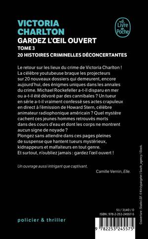 De retour sur les lieux du crime avec Victoria Charlton ! La célèbre youtubeuse braque les projecteurs sur 20 nouveaux dossiers qui demeurent, encore aujourd’hui, des énigmes uniques dans les annales du crime. Michael Rockefeller a-til disparu en mer ou a-t-il été mangé par des cannibales ? Un tueur en série a-t-il vraiment confessé ses actes crapuleux en direct à l’émission d’Howard Stern, célèbre animateur radiophonique américain ? Quel mystère cachent ces jeunes hommes retrouvés morts dans des cours d’eau, et dont les corps ne montrent aucun signe de noyade ? Plongez sans attendre dans ces pages pleines de suspense qu’hantent tueurs mystérieux, kidnappeurs et malfaiteurs en tous genres. Et surtout, n’oubliez jamais : gardez l’œil ouvert !